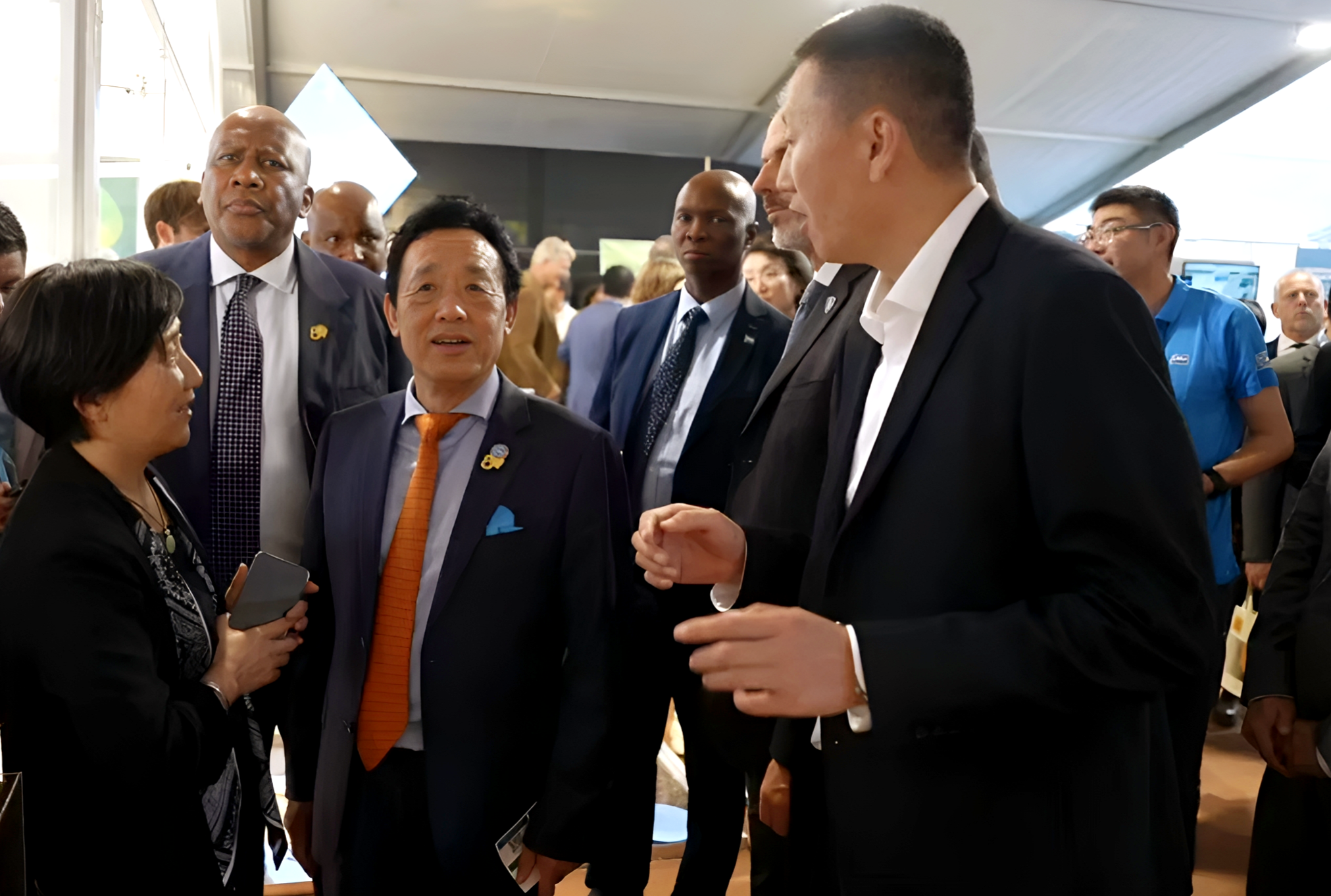 图为FAO总干事屈冬玉(左二)、莱索托国王莱齐耶三世(左一)等数十位国家元首和农业部长与金正大集团总裁万鹏(右一)在展会上就金正大缓控释肥技术进行交流。